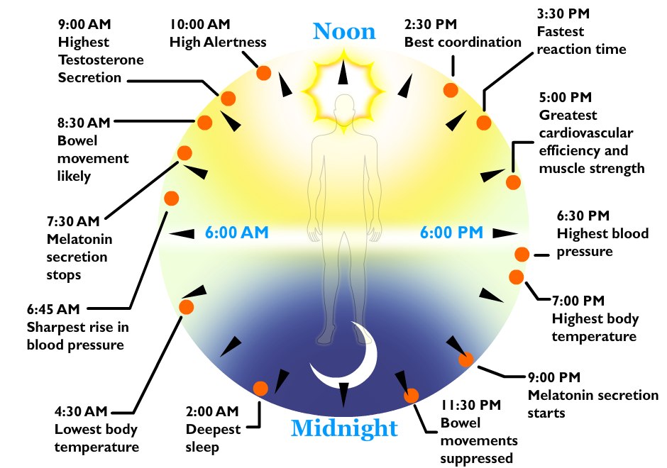 So your Circadian rhythms are highly dependent on the natural sunlight your body is receiving, particularly through your eyes. How much of this sunlight is being receives is key to determining the when certain hormones and neurotransmitters are released in order to set your body’s daily rhythms. This goes to support, that our behaviours and habits should be made, if possible, to match the natural rhythm of nature. A body should ideally be sleeping at night, and awake and alert when the sun is shining.
